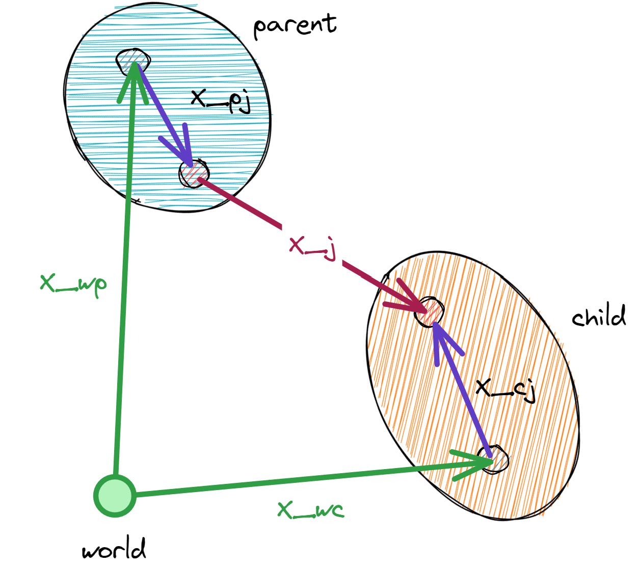 Given the parent body’s world transform \(x_{wp}\) and the joint transform \(x_{j}\), the child body’s world transform \(x_{wc}\) is computed as: